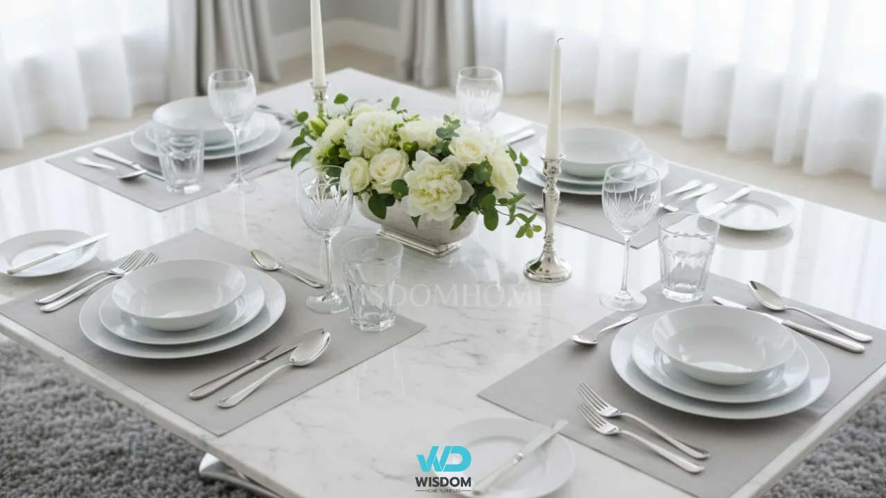 ใช้กฎ “Less is More” วางเพียงจานรองจาน (Charger Plate) คุณภาพดี เชิงเทียนหรูหรา และแจกันดอกไม้สดที่สูงไม่เกิน 30-40 ซม. เพื่อไม่บังสายตาขณะรับประทานอาหาร เพิ่มผ้ารองจานผ้าลินิน แก้วคริสตัล และชุดช้อนส้อมคุณภาพดี แต่เมื่อไม่ได้ใช้งานอาจวางแค่แจกันใบเดียวหรือชามผลไม้หินอ่อนกลางโต๊ะ